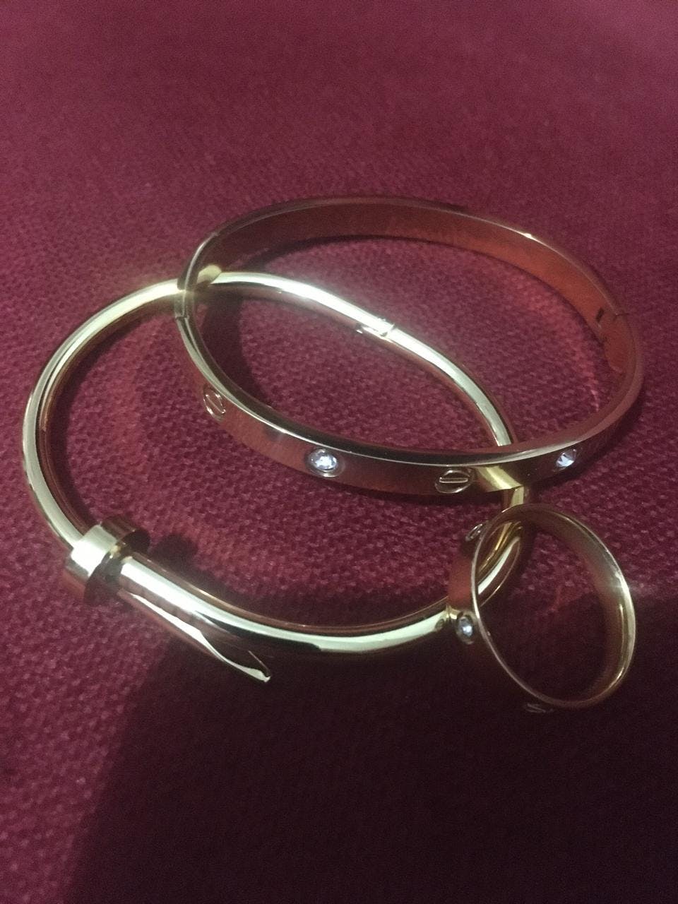 Enhance your collection of accessories with this Luxurious 18K Gold Plated 316L Stainless Steel Bundle Stacker 2 Bangles and a Ring. The refined and stylish design of this sleek steel piece adds a touch of sophistication to any outfit.